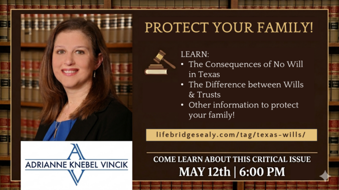 Come learn about the consequences of not having a Will in Texas, how Wills are different from Trusts, and what else you need to protect your family at death or if you become incapacitated.